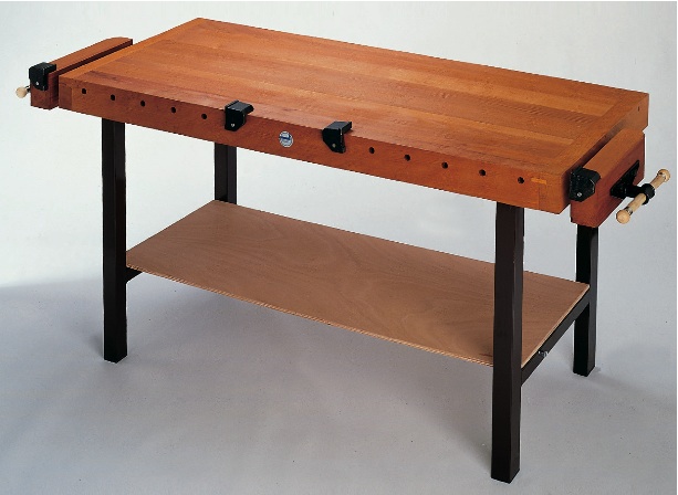 Universal Werkbank mit 2 Arbeitsplätzen, mit starker Rotbuchen-Platte, Alle Modelle ausgestattet mit Metalluntergestell 60/60 cm und Ab-lageboden, pro Arbeitsplatz 1 Hobelbankzange sowie 2 Universal-Spann ele men te zum horizontalen und vertikalen Einspannen der Werkstücke. Die Einspannelemente sind in den 90 mm starken Vorderkantriegel eingebohrt, so dass eine glatte Arbeitsfläche erhalten bleibt. Maße ohne Zangenüberstände: L/B/H 150/65/85 cm