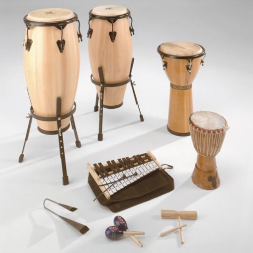 MUS 6 | MusikInstrumenteebestehend aus 15 Teilen:1 Glockenspiel, 25 Töne, mit Tasche • 1 Djembe professional • 1 African Djembe, klein • 1 Conga-Set natur • 1 Doppel-Tonblock mit Schlägel • 1 Mexikanische Maracas, Holz, oval, klein • 1 Agogo Bell