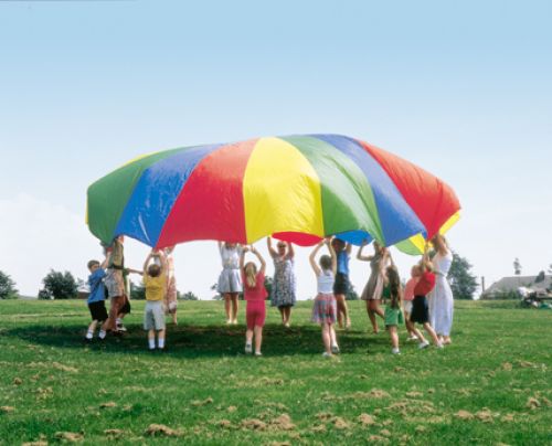 Buntes stabiles Schwungtuch mit eingenähten Griffen aus leichtem Fallschirmstoff.
